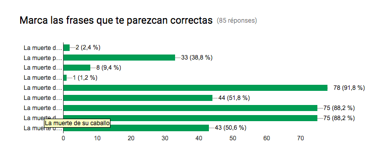 Há uns dias na equipa do projeto PORTLEX decidimos fazer um teste exploratório, isto é, informal, lançando um inquérito em castelhano na rede social Facebook. No questionário eram propostas 49 frases nominais com o substantivo ᴍᴜᴇʀᴛᴇ como núcleo. Os participantes deviam marcar as frases que julgavam corretas, já que, na realidade, a maioria das estruturas apresentadas eram o que em linguística costumamos caraterizar como agramaticais. Para a nossa surpresa, o inquérito foi completado por 85 pessoas em apenas um dia, talvez polo título “Muerte”, tão provocativo, ou mesmo por não termos revelado a finalidade do teste. De facto, nos comentários à postagem do inquérito, muitos participantes perguntavam para que fazíamos tal experimento. A entrada neste blog pretende dar respostas às perguntas colocadas mas sem entrar em pormenores técnicos e, sobretudo, tendo em conta que este teste não é válido do ponto de vista estatístico e portanto científico.