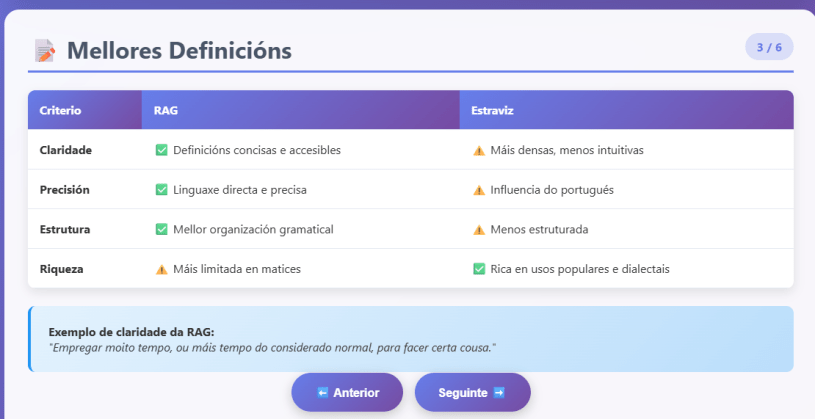 - Resultado final: uma apresentação multimodal funcional: O culminar destes passos foi uma apresentação multimodal funcional que pode ser consultada aqui. Esta apresentação combina conteúdo visual (a estrutura HTML cos principais dados da análise) e auditivo (o podcast explicativo), oferecendo uma exploração completa e envolvente da análise comparativa das duas entradas de dicionários.